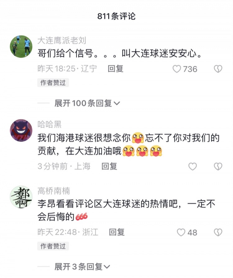 11月26日讯 昨天,李昂更新社媒,与大连球迷进行了互动。