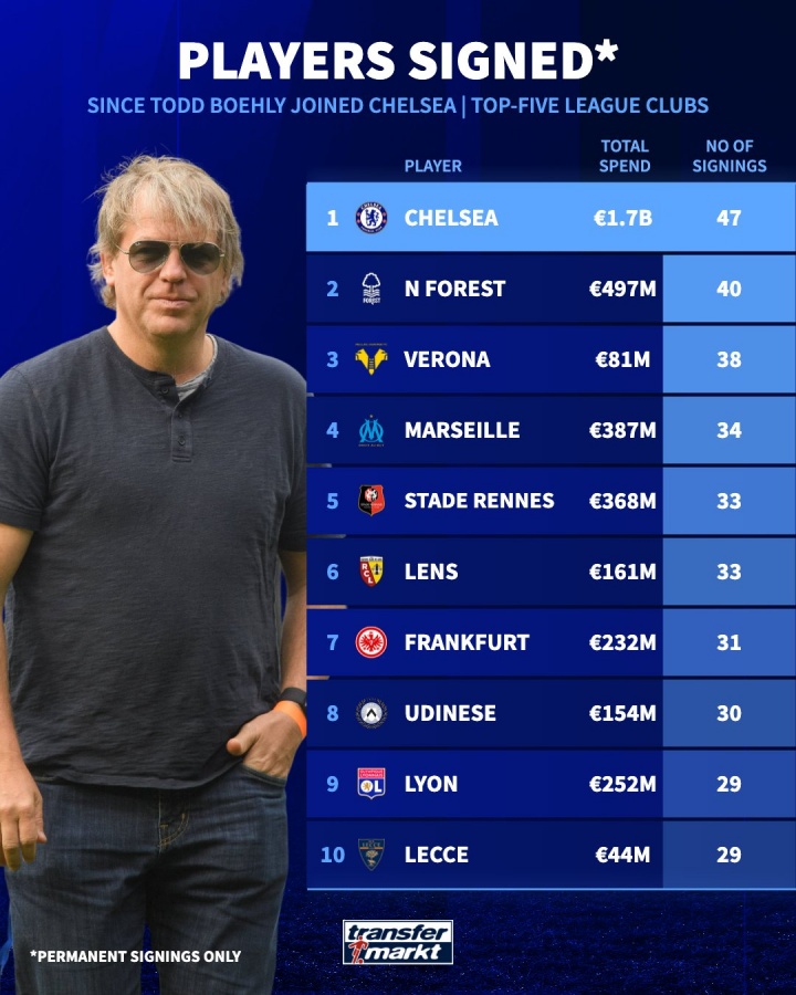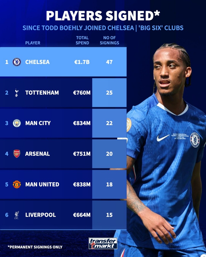 英超big6引援用度及东说念主数:切尔西浪掷17亿欧签下47名球员,断档超越↓