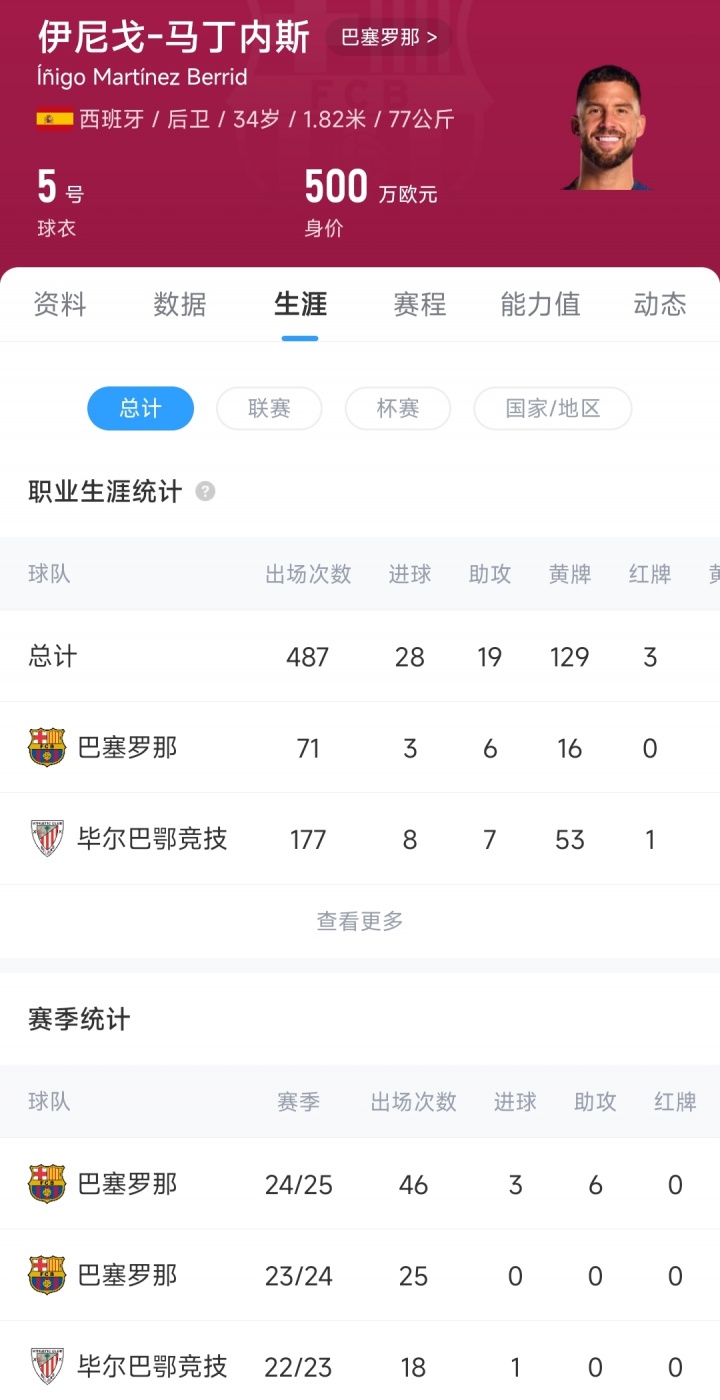 34岁的西班牙后卫伊尼戈-马丁内斯,2023年7月解放身加盟巴萨,两个赛季共代表巴萨出战71场比赛,打进3球并送出6次助攻。当今伊尼戈-马丁内斯的德回身价为500万欧元。