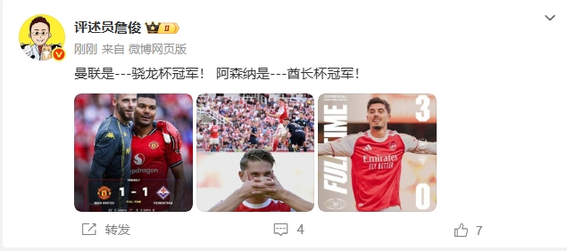 詹俊:曼联是---骁龙杯冠军! 阿森纳是---酋长杯冠军!