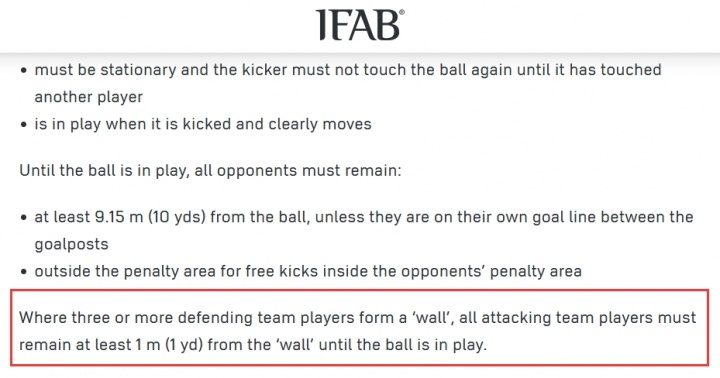 IFAB官方限定:当三名或三名以上防范队员构成“东说念主墙”时,扫数热切队员必须距离“东说念主墙”至少1米,直至比赛从头运行。
