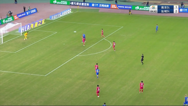 08月17日讯 今晚苏超南京vs盐城队,比赛第65分钟,南京队球员戈伟超远距离头球破门!大禁区线上起跳冲顶,南京队2-2扳平盐城。