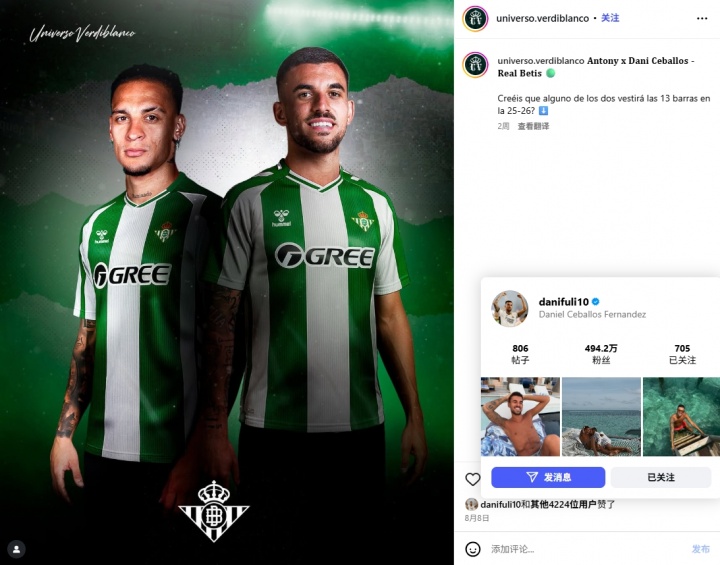 贝蒂斯球迷社媒账号universo.verdiblanco晒出海报,本色为塞巴略斯、安东尼身穿贝蒂斯球衣,配文:“安东尼X塞巴略斯——贝蒂斯。你们以为他们两东说念主会在25-26赛季身披贝蒂斯的球衣吗?”