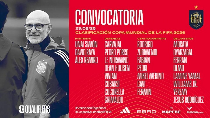 08月29日讯 西班牙国度队公布了新一期球员名单,亚马尔领衔,复出的卡瓦哈尔、罗德里总结,莫拉塔、赫伊森、苏维门迪等球员入选。西班牙国度队将建设9月份进行的世初赛欧洲区比赛。