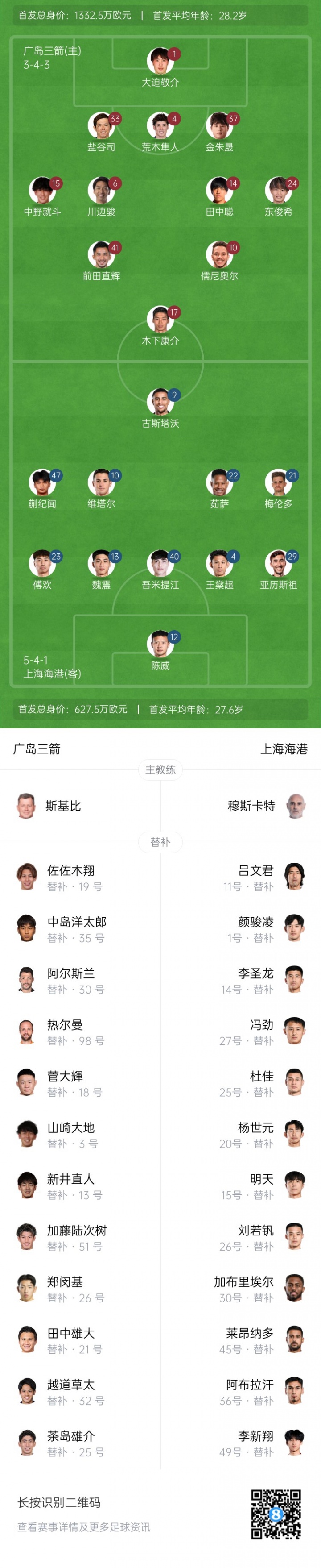 广岛三箭首发:1-大迫敬介、4-荒木隼东说念主、15-中野就斗、33-盐谷司、37-金朱晟、6-川边骏、10-马科斯·儒尼奥尔、14-田中聪、24-东俊希、17-木下康介、41-前田直辉