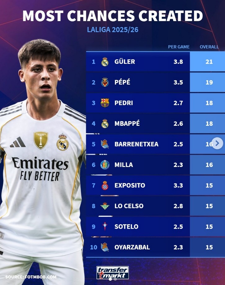 9月30日讯 德转盘货了本赛季西甲创造契机榜单,其中居勒尔所有21次创造契机居首,具体如下(场均数据+总和据):