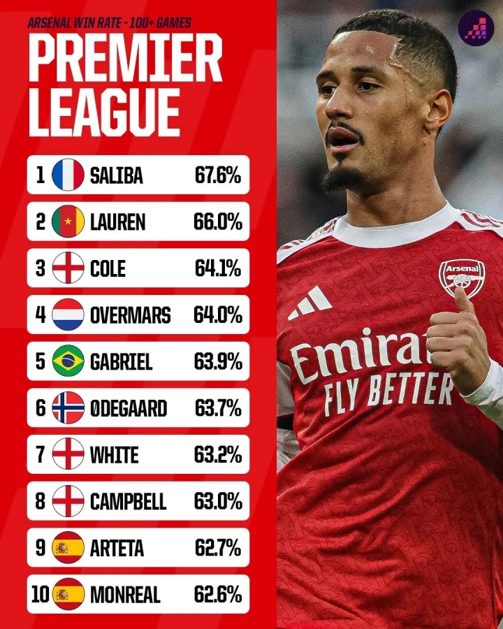 阿森纳球员英超胜率榜:萨利巴67.6%居首,加布第5、阿尔特塔第9