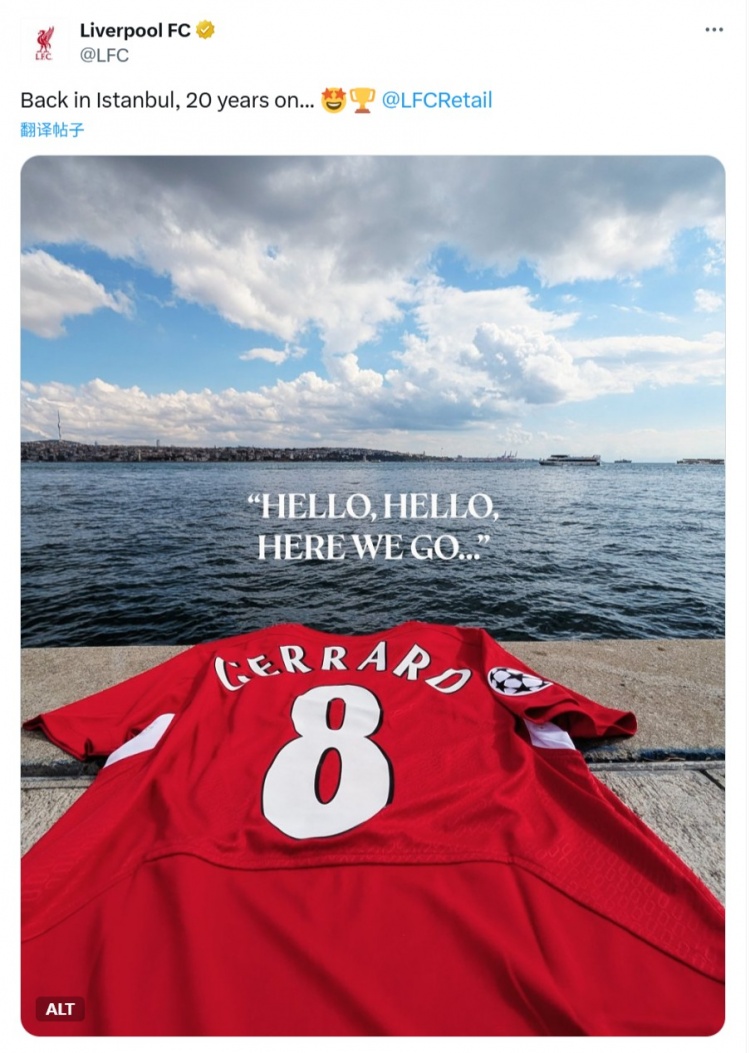 利物浦官方晒杰拉德球衣:20年后重回伊斯坦布尔