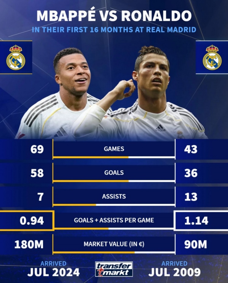 姆巴佩、C罗着力皇马前16个月数据: