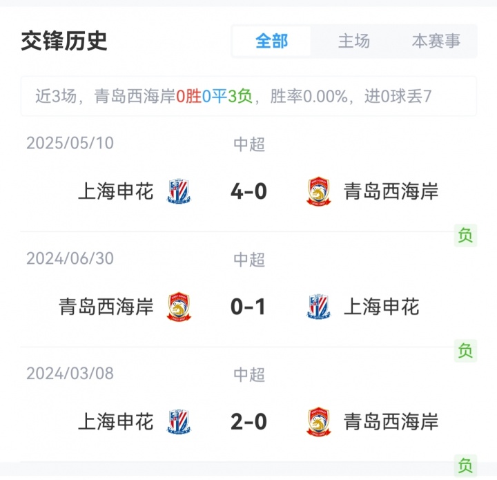 青岛西海岸9胜9平8负积36分,排行中超第8;上海申花16胜6平4负积54分,排行中超第3。