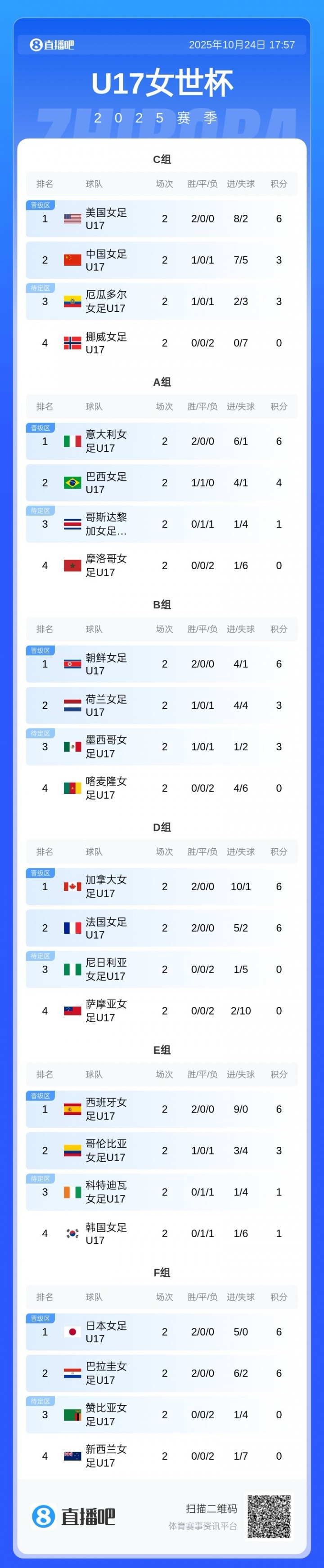 本届U17女足寰球杯共有24队分为6个小组,每组前二以及4个得益最佳的小组第三构成16强。若中国女足U17末轮靡烂,则可能需要以小组第三的身份与其他队相比战绩。