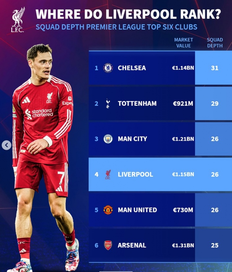 斯洛特称东谈主手不及?德转列BIG6声势深度:利物浦26东谈主并排第三