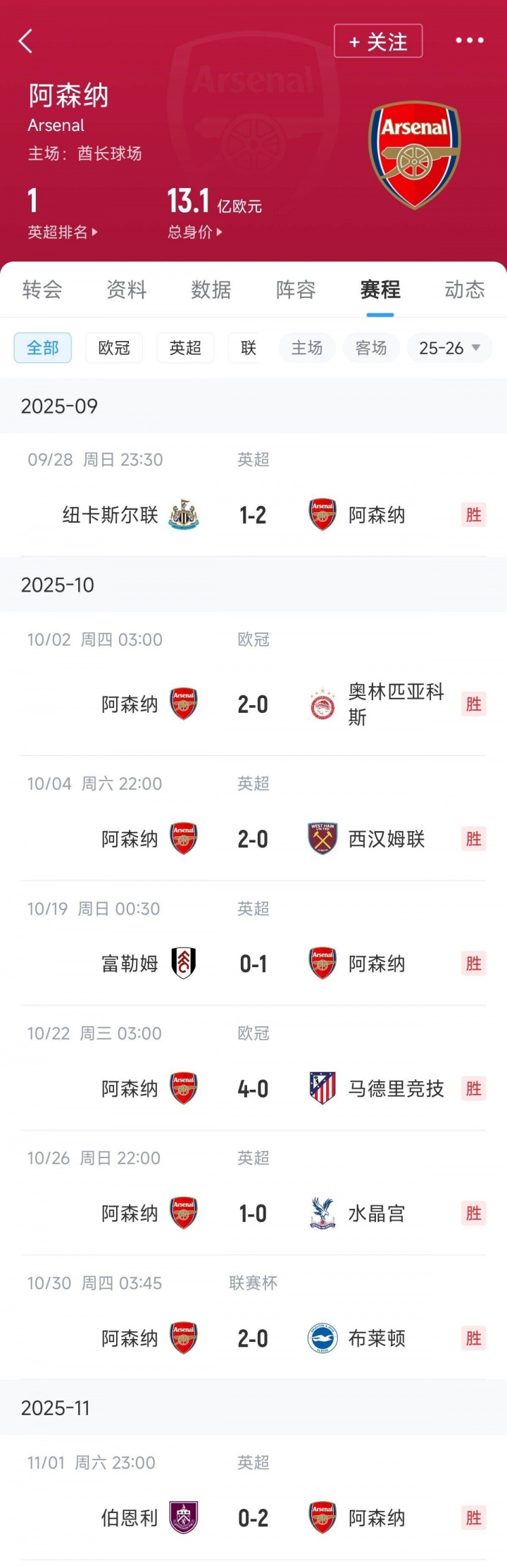 枪手近期也曾保执了7场0失球,他们上一次丢球是在9月底的英超,被沃尔特马德头球砸穿球门。
