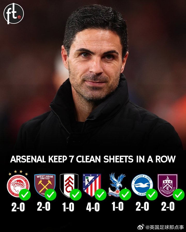 稳!阿森纳完成流畅7场零封,同期打进14球