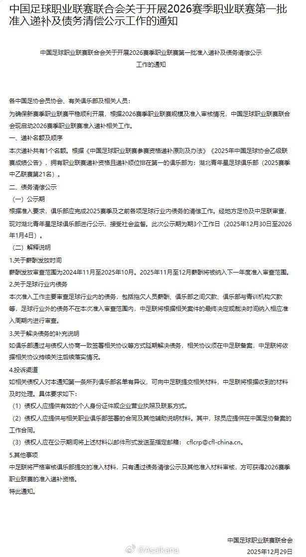由于广西平果将被取销准入履历,原降入中冠的湖北后生星启动进行准入递补和债务归还审查,有望讲究中乙联赛。