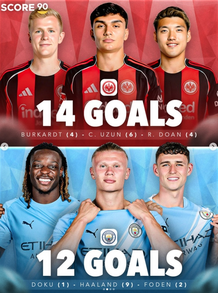 9月30日讯 Score90盘货了五大联赛球队三东谈主组本赛季当今在各项赛事进球榜,其中拜仁三将共打进23球居首,具体如下:
