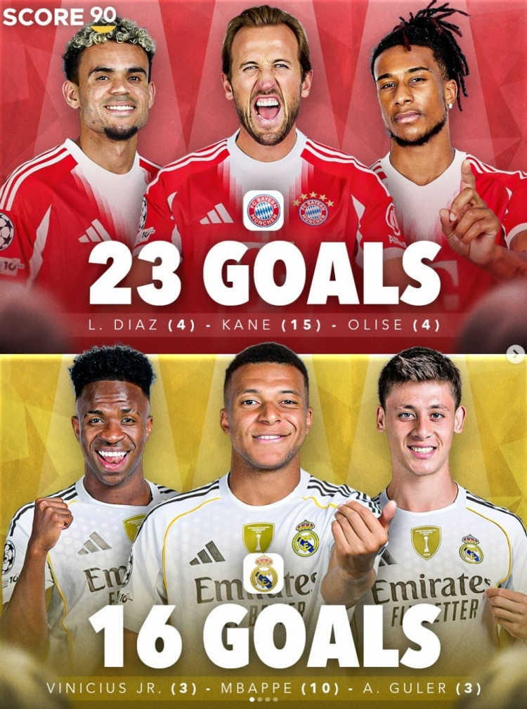 本赛季五大联赛进球最多三东谈主组:拜仁3将23球居首,皇马16球次席