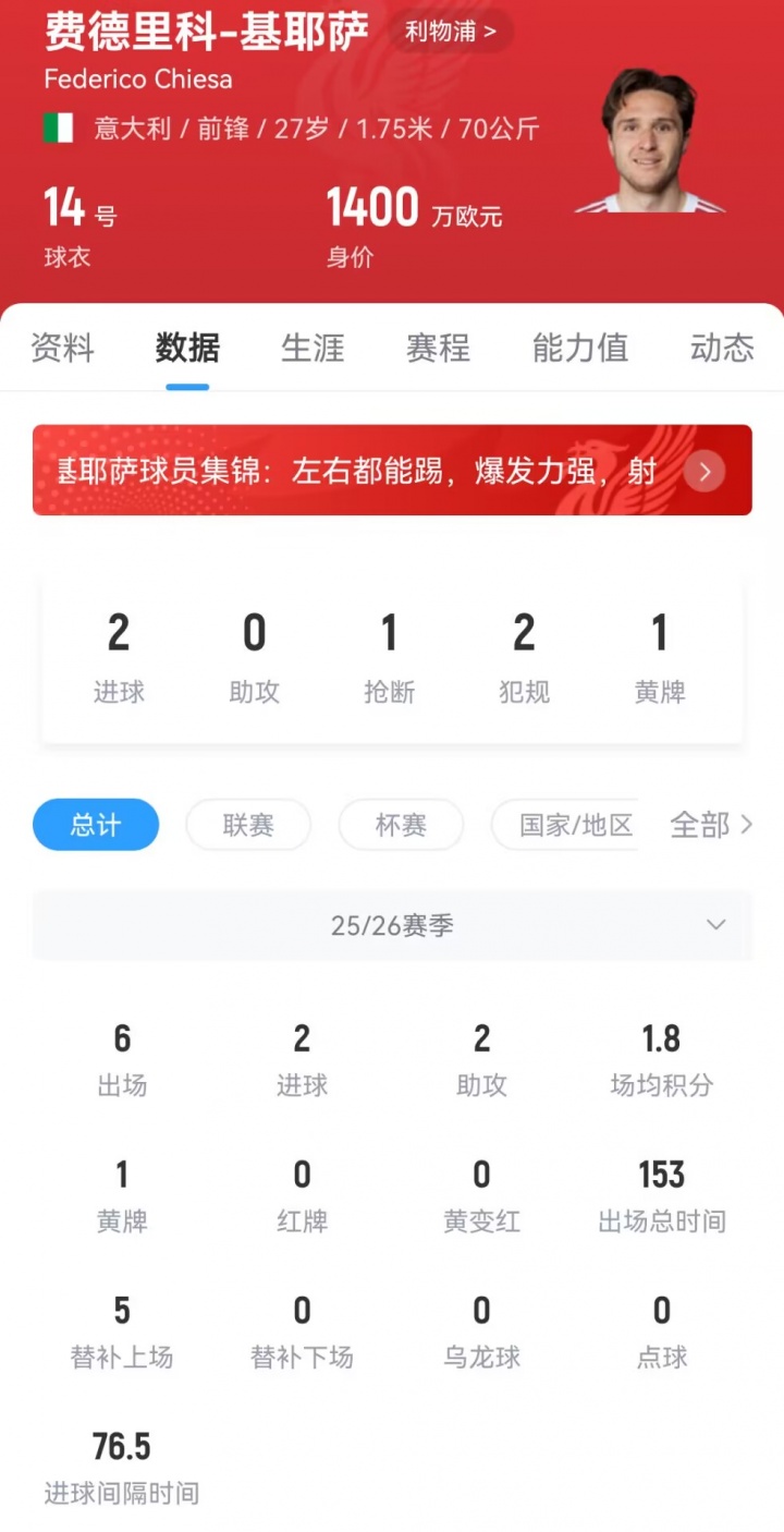 本赛季,基耶萨还是为利物浦在各项赛事中出场6次,孝顺2球2助,当今的身价为1400万欧元。