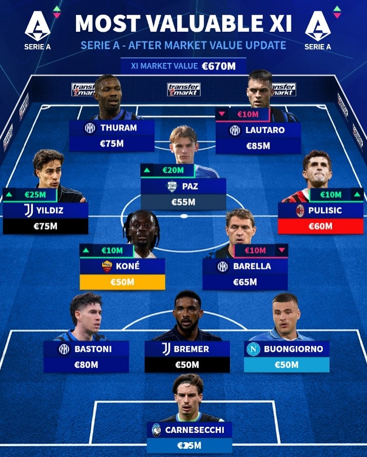 10月8日讯 德转更新了球员身价名次,意甲最贵首发11东说念主也随之出炉,国米的劳塔罗和图拉姆领衔锋线,AC米兰球员普利西奇入选。