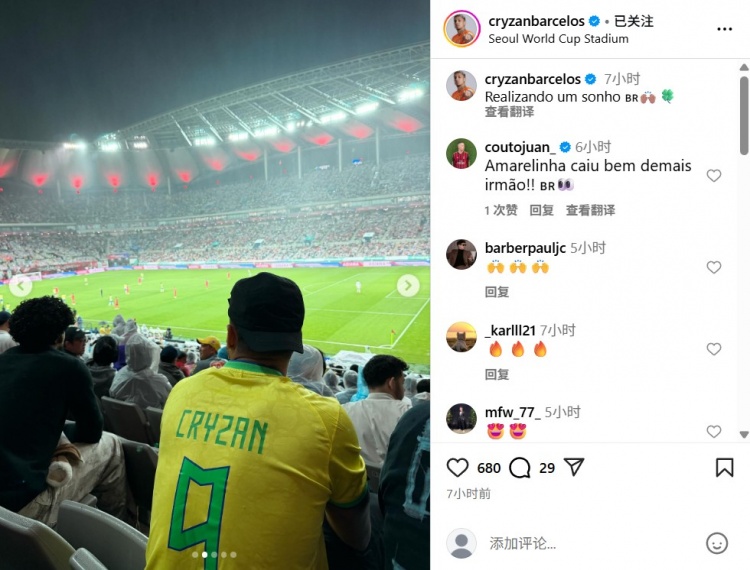身穿我方名字的巴西9号球衣!克雷桑现场不雅战巴西vs韩国