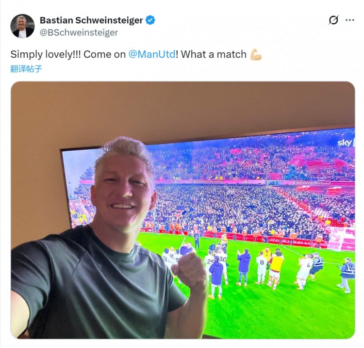 曼联旧将、德国足坛名宿施魏因斯泰格通过电视不雅看双红会,赛后他晒出我方在电视机前的像片,配文:“险些太奥妙了!加油曼联,何等精彩的比赛!”