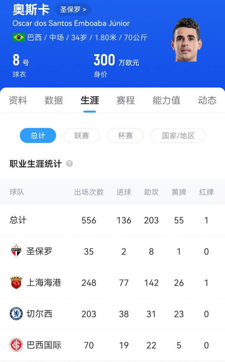 34岁的奥斯卡作事生存曾效率巴西海外、切尔西、上海海港、圣保罗,上赛季中超逼迫后他解放身回到巴西,加盟圣保罗。