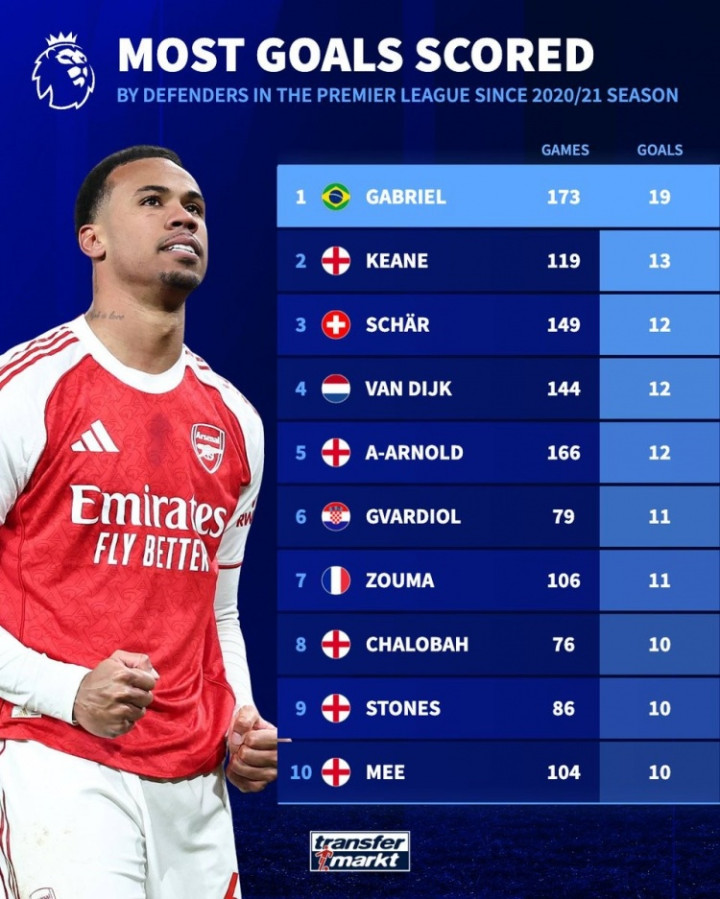 直播吧12月31日讯《转会市集》统计了20-21赛季以来的英超后卫进球情况,枪手中卫加布里埃尔独自领跑。