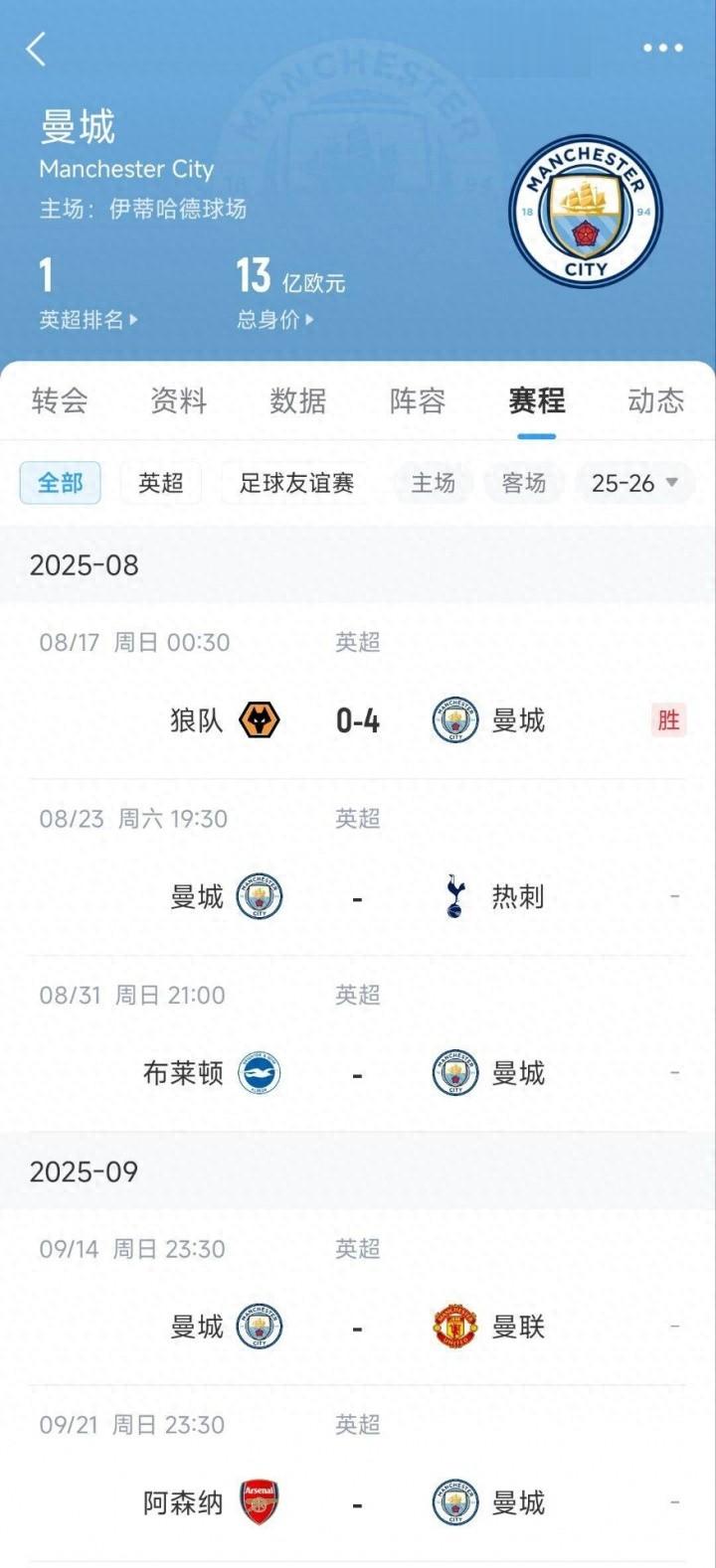 血战4连! 曼城大捷锁定首轮榜首, 但接下来4战: 热刺海鸥曼联枪手
