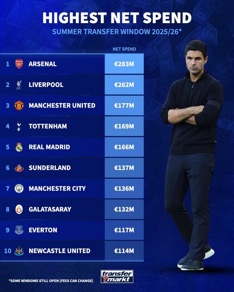 夏窗净支拨榜:阿森纳领衔英超8队无切尔西,皇马&加拉塔萨雷在列