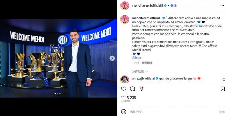 “海外米兰将永久留在我心中。带着谢忱之情,我向你们统共东说念主告别,并祝贺你们改日得到更多荣誉!满怀心思地这样作念。——梅赫迪-塔雷米。”