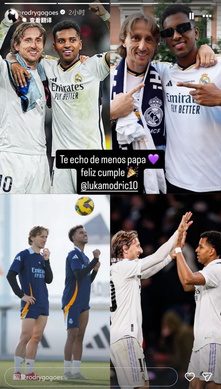 罗德里戈社媒晒多张合影为莫德里奇庆生:念念你了,爸爸