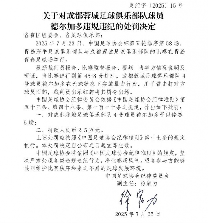 07月25日讯 中国足协官方公布处理决定,成齐蓉城球员德尔增多在足协杯对阵青岛海牛的比赛中,无球情状下实施暴力步履,被停赛5场,罚金2.5万元。