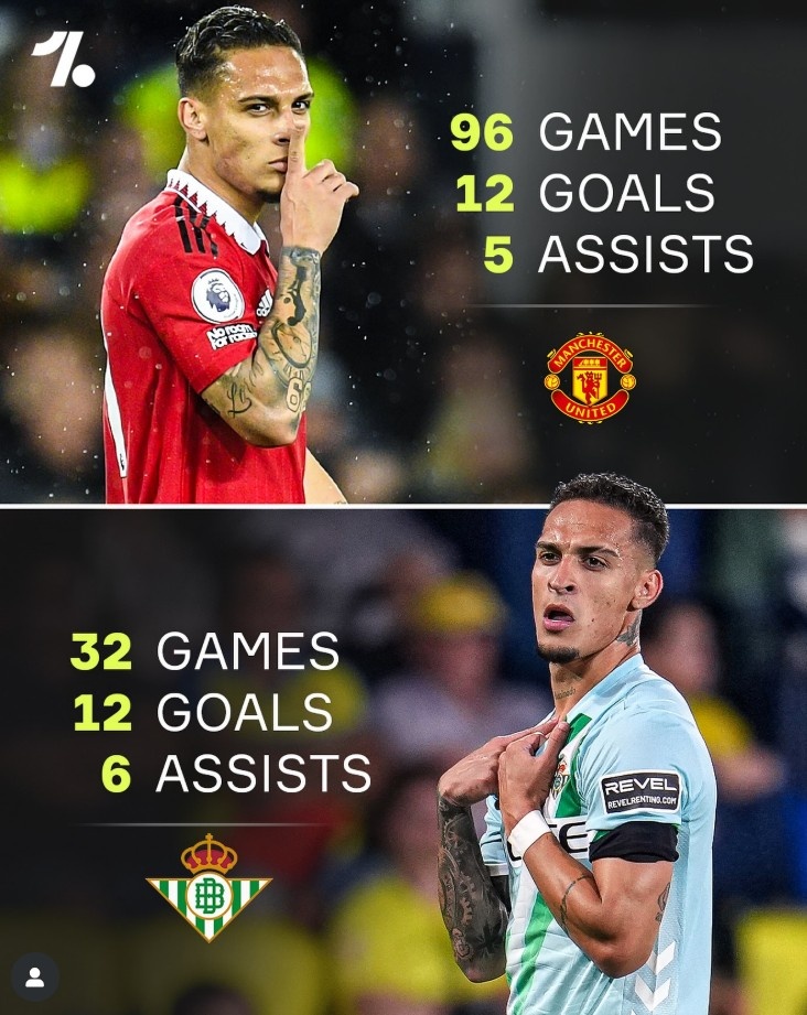 据统计,安东尼在贝蒂斯糊口32场各项赛事孝敬12球6助攻,径直参与18球,而其在曼联糊口96场比赛打进12球助攻5次,径直参与17球。