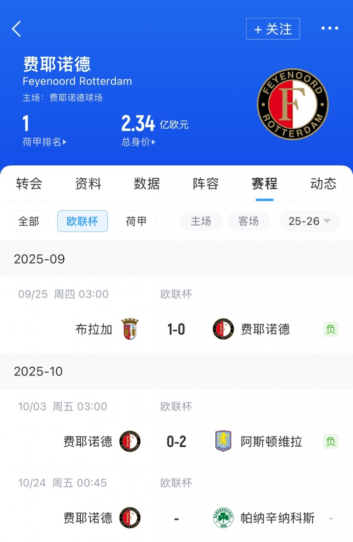 而在欧联赛场,费耶诺德际遇了两连败,0-1输给葡超布拉加,0-2不敌阿斯顿维拉。欧战开局2场0进球,亦然费耶诺德队史最差记载。