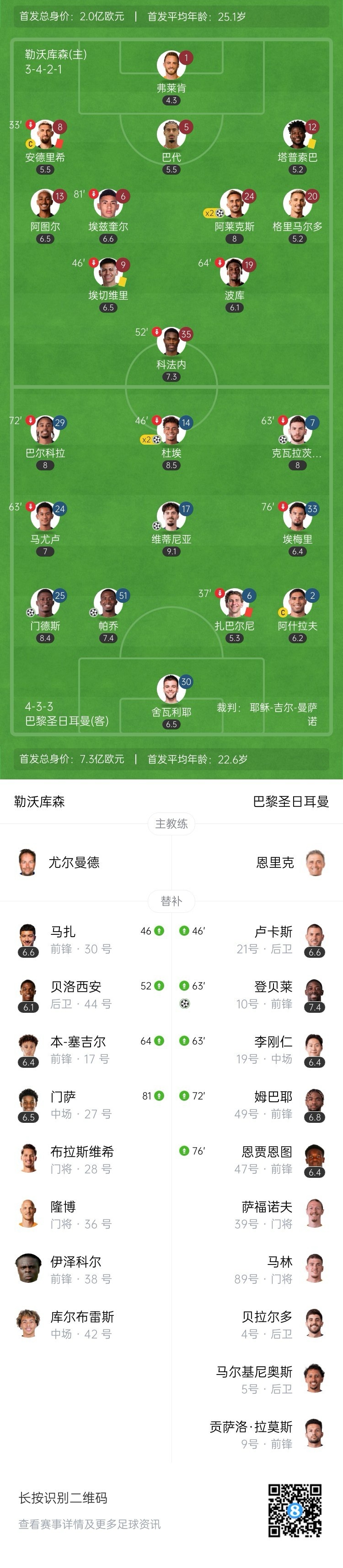 本场比赛上半场比分已是巴黎4-1勒沃库森,两边此时皆是十东说念主作战。下半场越过的巴黎却澈底充公手,除了换上卢卡斯(因扎巴尔尼红牌)补充后防外,其余上阵的替补全是时尚:登贝莱、李刚仁、姆巴耶、恩贾恩图。最终巴黎下半场又轰3球,全场比分7-2。