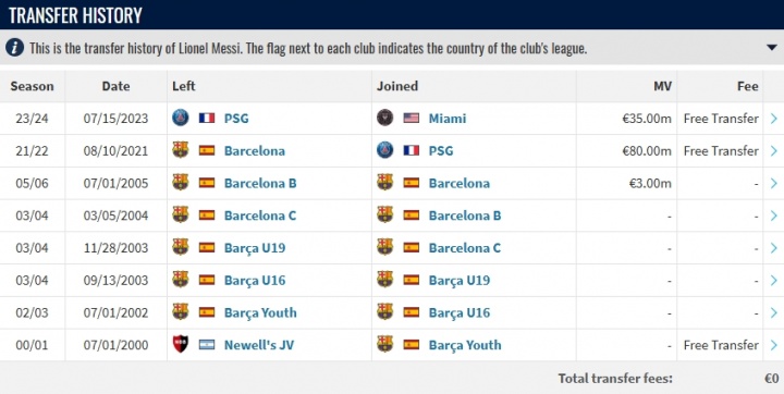 梅西作事生计先后效率巴萨、巴黎以及迈阿密国外三家俱乐部,两次转会梅西均是解放身离队,无转会费。在梅西的德转页面中,他的生计历史转会费总和昭着走漏为0。