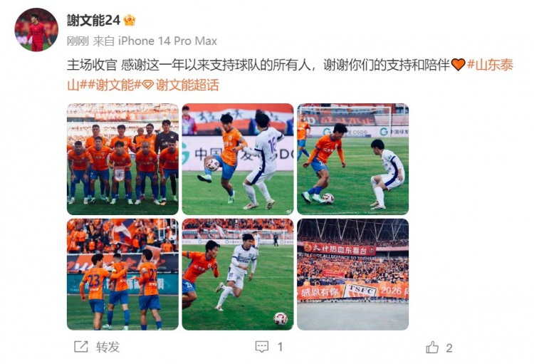中超第29轮,泰山队主场2-1驯服津门虎,这亦然泰山队赛季主场收官战。赛后,谢文能更新社媒牵挂,他写说念:主场收官 感谢这一年以来撑抓球队的通盘东说念主,谢谢你们的撑抓和跟随。