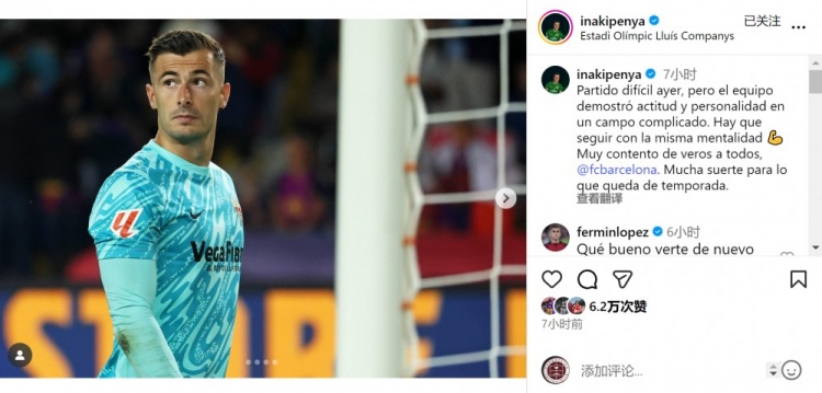 佩尼亚社媒谈对阵巴萨:很喜跃见到老队友,祝巴萨剩余赛季好运