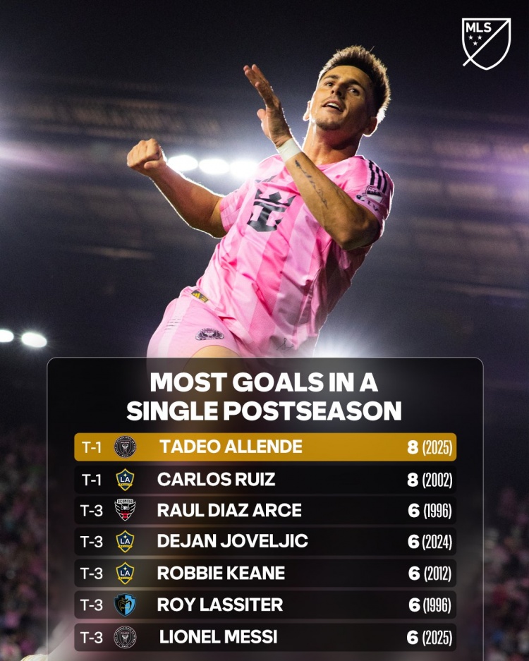 好意思职联历史单届季后赛进球榜:阿连德8球居首,梅西6球第三