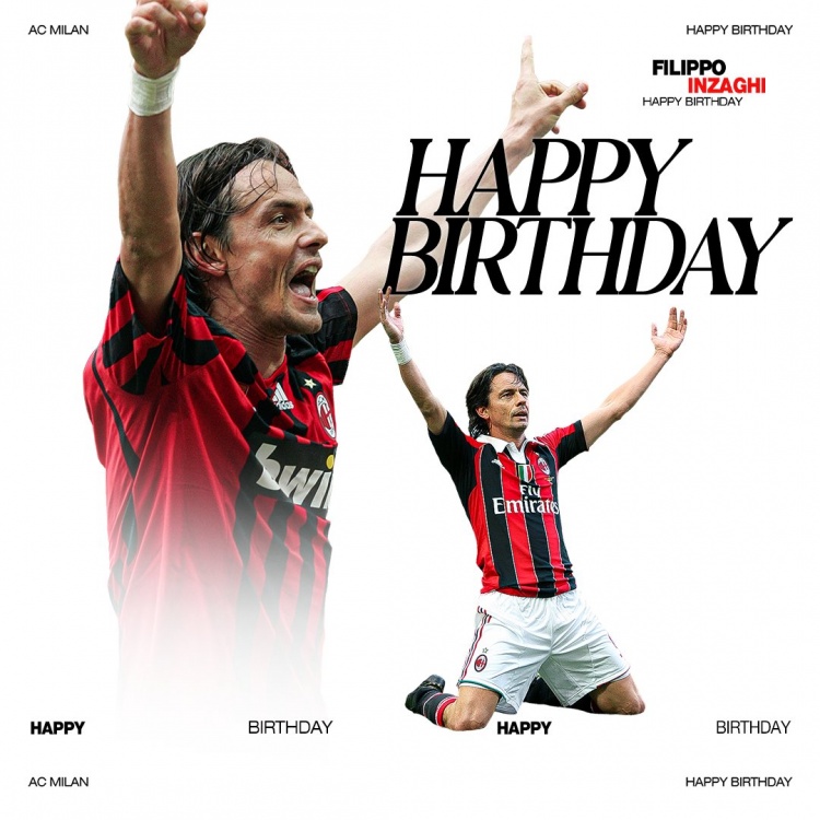 8月9日讯 今天是意大利足坛名宿因扎吉的52岁生辰,老东家米兰为他奉上祝愿。
