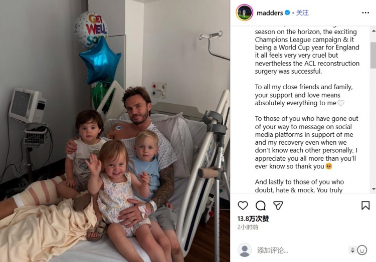 在搪塞媒体上,麦迪逊写谈:我从未阅历过如斯的低谷!在这个要津技能遭受伤病让我心碎不已。来日便是欧超杯,英超新赛季也行将开启,咱们也将迎来得意东谈主心的欧冠征途。何况,本年是英格兰的宇宙杯年,这一切齐显得极度罪过。不外,我的十字韧带重建手术尽头得胜。