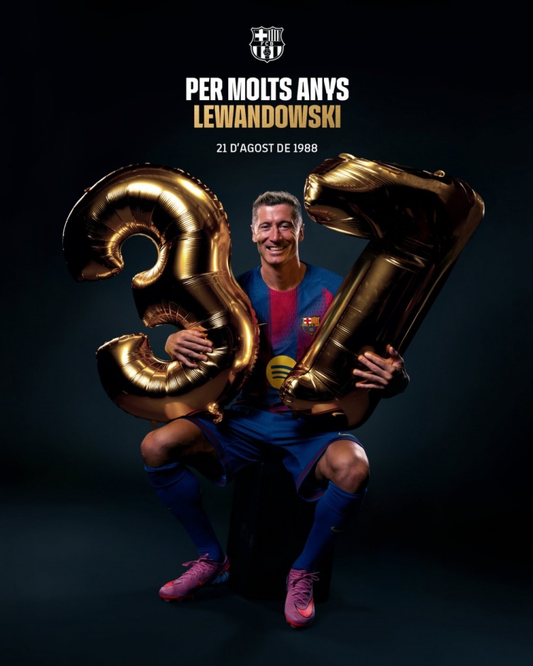 巴萨官方社媒晒出为莱万制作的海报,配文:“诞辰惬心,莱万!”