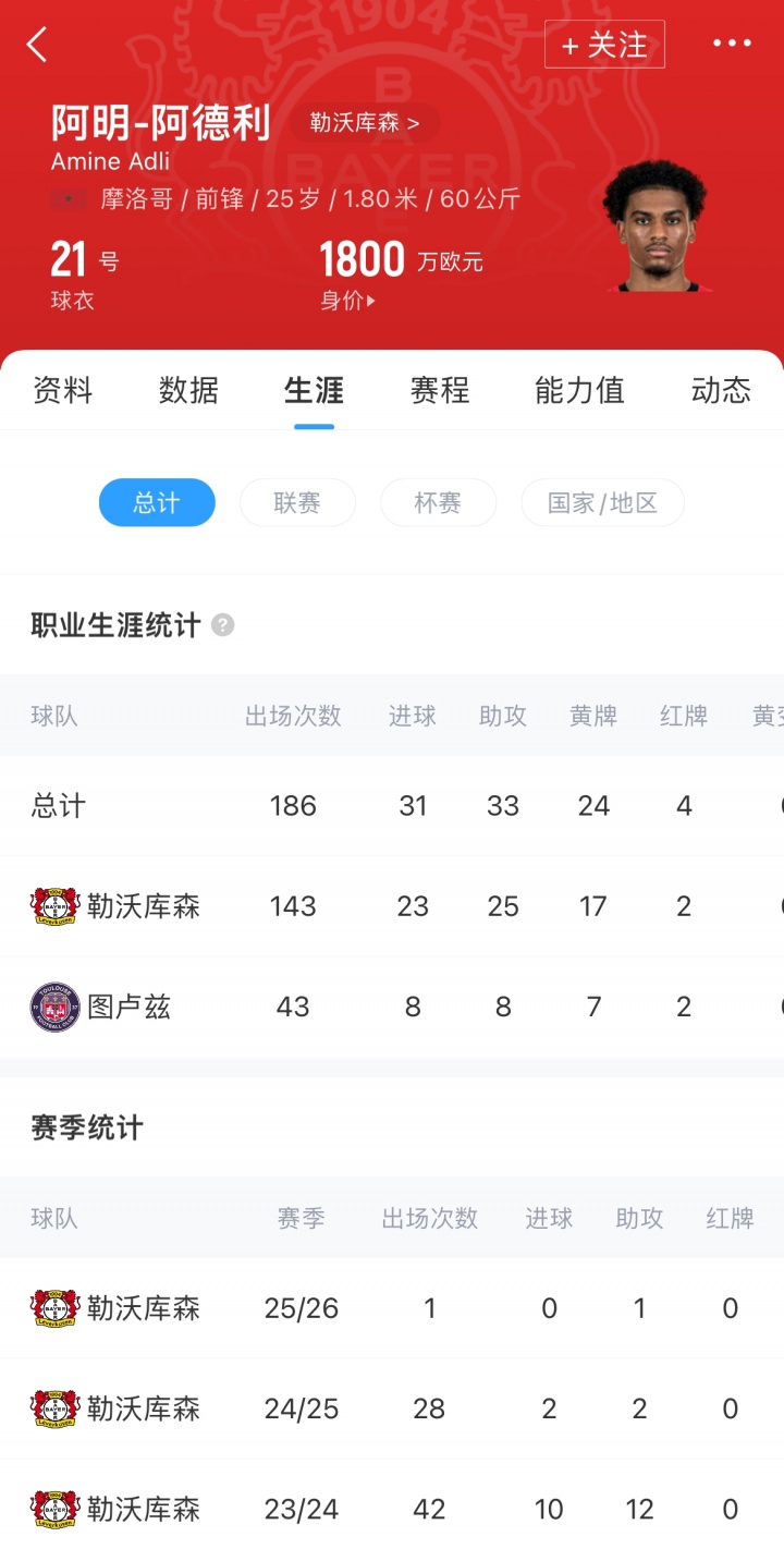 阿明-阿德利25岁,摩洛哥籍前卫。上赛季他为药厂各项赛事出场28次,赢得2粒进球,当今球员德回身价为1800万欧。