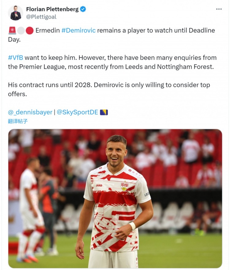 媒体指出,德米洛维奇转会窗口尾声阶段的动态值得包涵,斯图加特但愿留下这位27岁的波黑时尚,但多家英超俱乐部斟酌球员的情况,包括最近来自为兹联和诺丁汉丛林的斟酌。