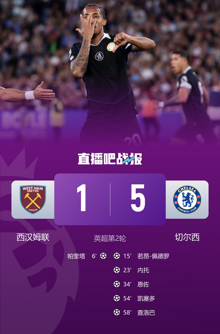 赛季首胜!切尔西5-1大捷西汉姆联 佩德罗1射2传恩佐&凯塞多立功