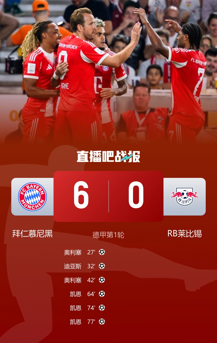 德甲首轮,拜仁6-0横扫莱比锡拿下开门红,凯恩首轮就戴帽,新援迪亚斯1球2助发达出色,奥利塞斩获两球。