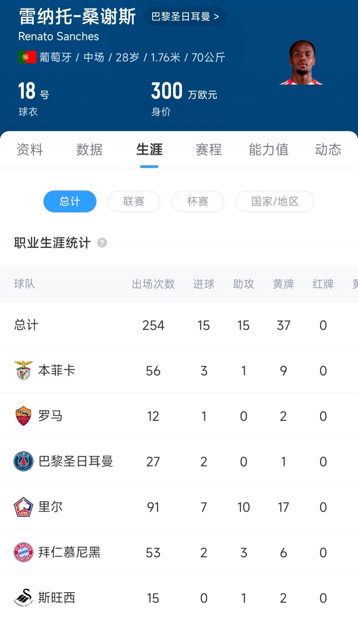 现年28岁的葡萄牙中场桑谢斯,2022年8月以1500万欧元的转会费,从里尔加盟巴黎,随后被先后外租到罗马和本菲卡。