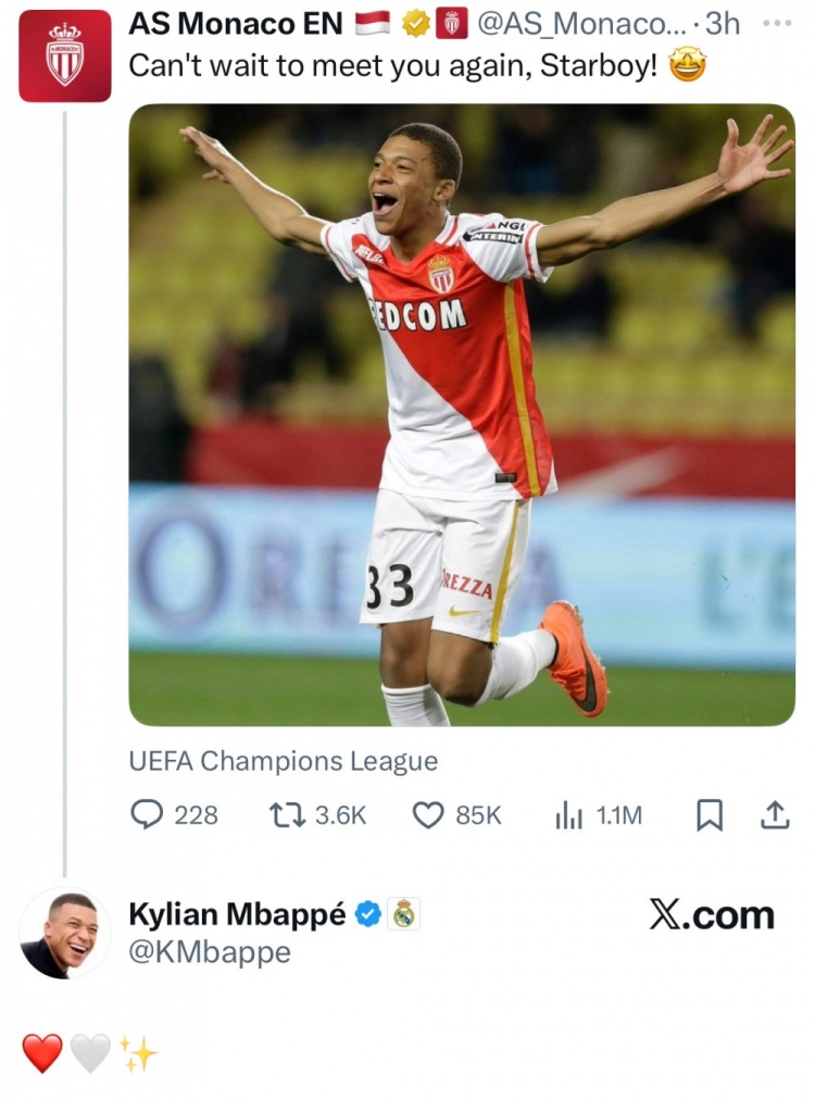 在抽签出炉后摩纳哥官推晒出了姆巴佩效用球队的青涩照,并配文写谈:“依然迫不足待念念相逢到你了,星光男孩!”姆巴佩在社媒下用代表摩纳哥主场球衣脸色的“❤️🤍”进行文告。