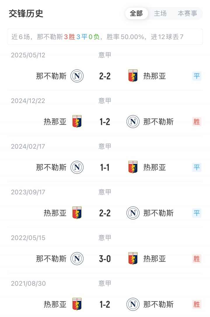 那不勒斯联赛4胜1负积12分,上轮客场1-2不敌米兰碰到联赛首败;热那亚联赛2平3负积2分,开季5轮不堪。那不勒斯对阵热那亚已蚁合6场不败(3胜3平)。