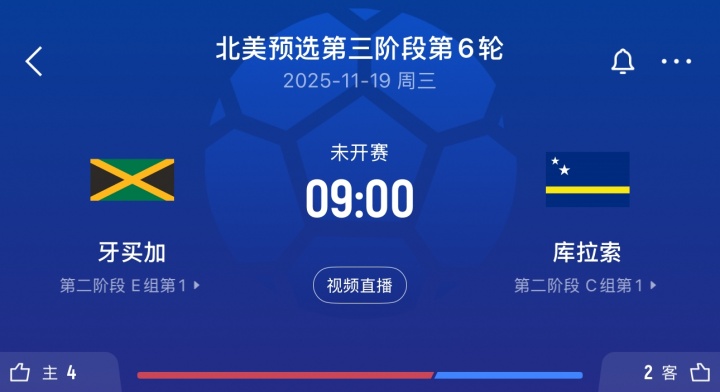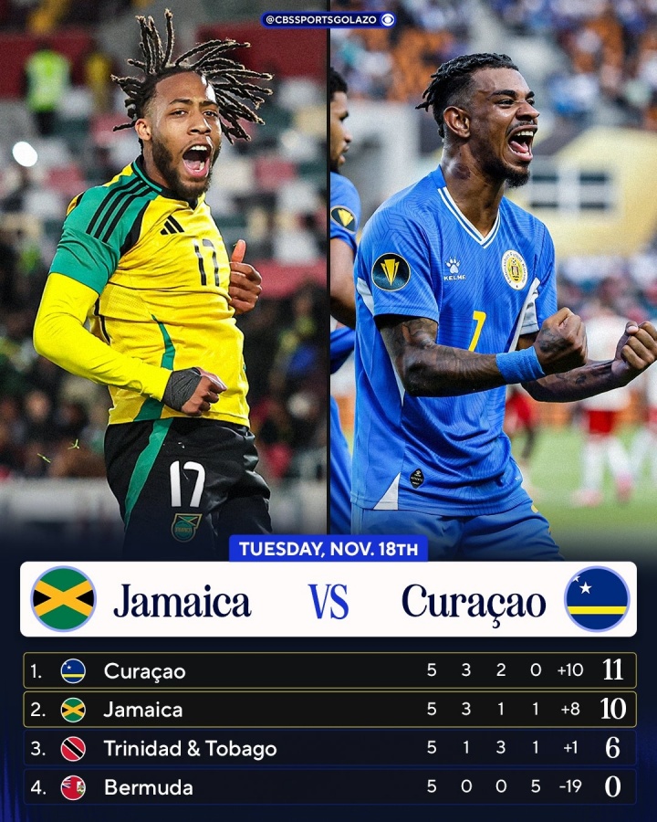 5轮事后,库拉索11分小组第一,卓绝小组第二牙买加1分,下轮两队将获胜交手,库拉索不败即纵贯寰宇杯,比赛于北京工夫11月19日9点在牙买加主场进行。两队首回合交手,库拉索主场2-0打败牙买加。